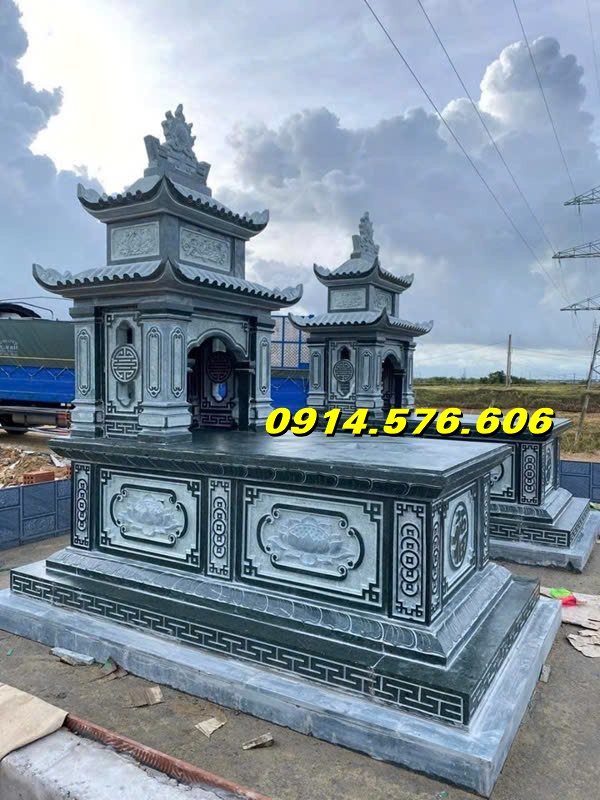 61 Mộ mồ mả đá hai mái đẹp bán tại Cà Mau, còn gọi là mộ mồ mả hai mái đao che, mộ hai che là một mẫu mộ có mái che, với chi phí rẻ được nhiều người lựa chọn. Mộ đẹp hai mái thường làm bằng các chất liệu đá nguyên khối như: đá xanh, đá ninh bình, đá thanh hóa, đá vàng, đá trắng và chạm khắc nhiều hoa văn tinh tế. Vì vậy các mộ bằng đá thường đẹp mắt và mang nhiều ý nghĩa tốt về mặt phong thuỷ.